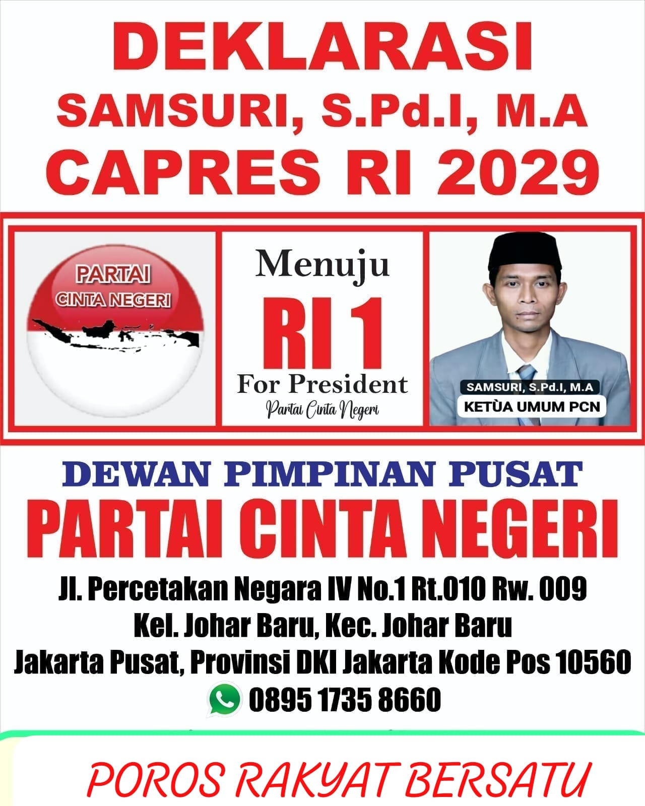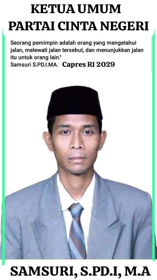 Jakarta – Langkah serius Partai Cinta Negeri (PCN) dalam menatap Pemilihan Presiden 2029 dimulai secara resmi pada Minggu, 27 April 2025. Dalam sebuah acara yang digelar secara tertib dan khidmat di ruang pertemuan DPP Partai Cinta Negeri, Jalan Percetakan Negara IV No.1, Johar Baru, Jakarta Pusat, nama Samsuri, S.Pd.I, M.A., Pendiri sekaligus Ketua Umum PCN, secara resmi diumumkan sebagai Calon Presiden Republik Indonesia untuk periode 2029–2034.